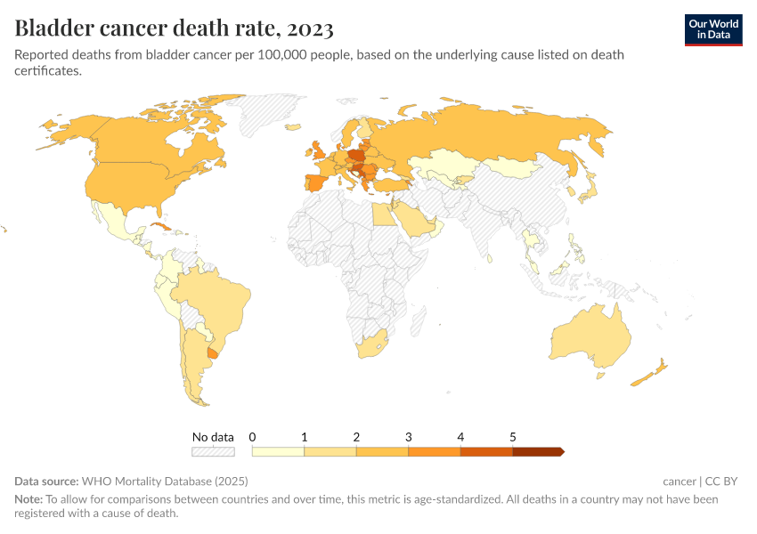 WHO Mortality Database (2024) – with minor processing by Our World in Data. “Bladder cancer death rate” [dataset]. WHO Mortality Database, “WHO Mortality Database” [original data]. Retrieved June 26, 2025 from https://remove-datapage-tags.owid.pages.dev/grapher/bladder-cancer-death-rate