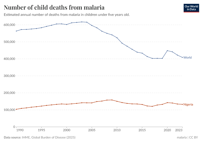 IHME, Global Burden of Disease (2024) – with minor processing by Our World in Data. “Number of child deaths from malaria” [dataset]. IHME, Global Burden of Disease, “Global Burden of Disease - Deaths and DALYs” [original data]. Retrieved June 26, 2025 from https://remove-datapage-tags.owid.pages.dev/grapher/child-deaths-from-malaria-number