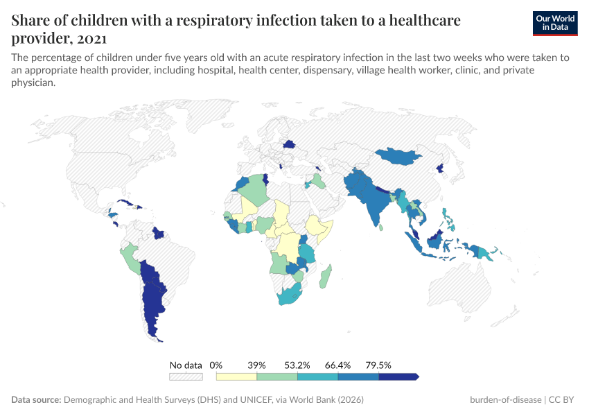 “Data Page: Share of children with a respiratory infection taken to a healthcare provider ”. Our World in Data (2025). Data adapted from Demographic and Health Surveys (DHS) and UNICEF, via World Bank. Retrieved from https://remove-datapage-tags.owid.pages.dev/grapher/children-treated-ari [online resource]How to cite this data