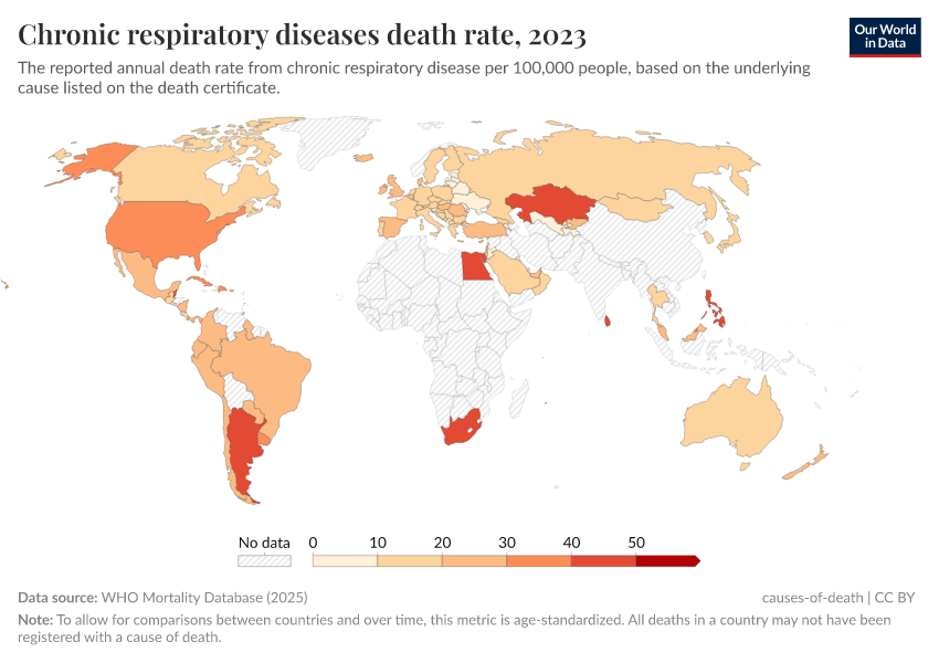 “Data Page: Chronic respiratory diseases death rate”, part of the following publication: Saloni Dattani, Fiona Spooner, Hannah Ritchie, and Max Roser (2023) - “Causes of Death”. Data adapted from WHO Mortality Database. Retrieved from https://remove-datapage-tags.owid.pages.dev/grapher/chronic-respiratory-diseases-death-rate-who-mdb [online resource]How to cite this data