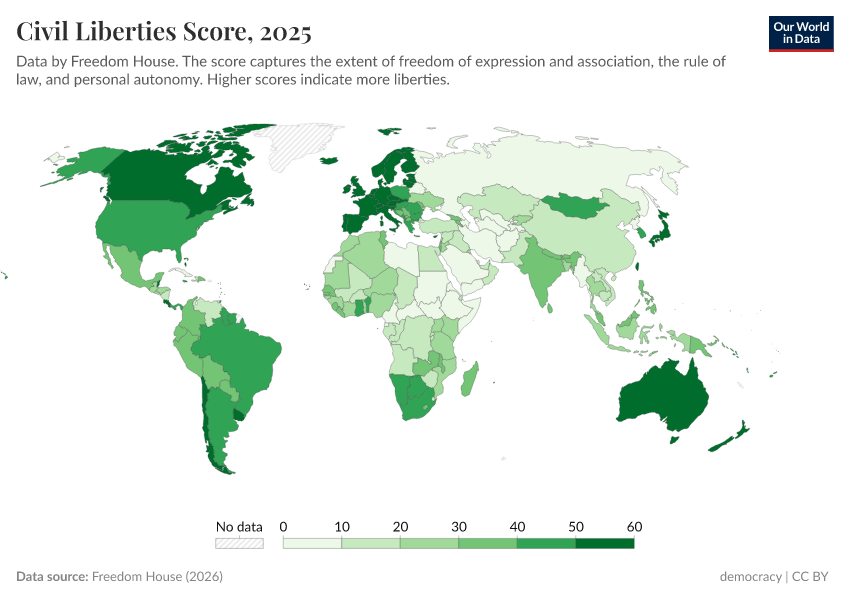 Freedom House (2025) – processed by Our World in Data. “Civil liberties score” [dataset]. Freedom House, “Freedom in the World” [original data]. Retrieved June 26, 2025 from https://remove-datapage-tags.owid.pages.dev/grapher/civil-liberties-score-fh