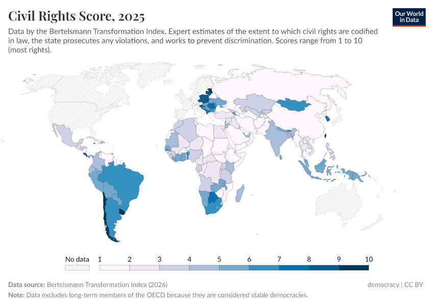 Bertelsmann Transformation Index (2024) – processed by Our World in Data. “Civil rights score” [dataset]. Bertelsmann Transformation Index, “Bertelsmann Transformation Index, Scores” [original data]. Retrieved June 26, 2025 from https://remove-datapage-tags.owid.pages.dev/grapher/civil-rights-score-bti