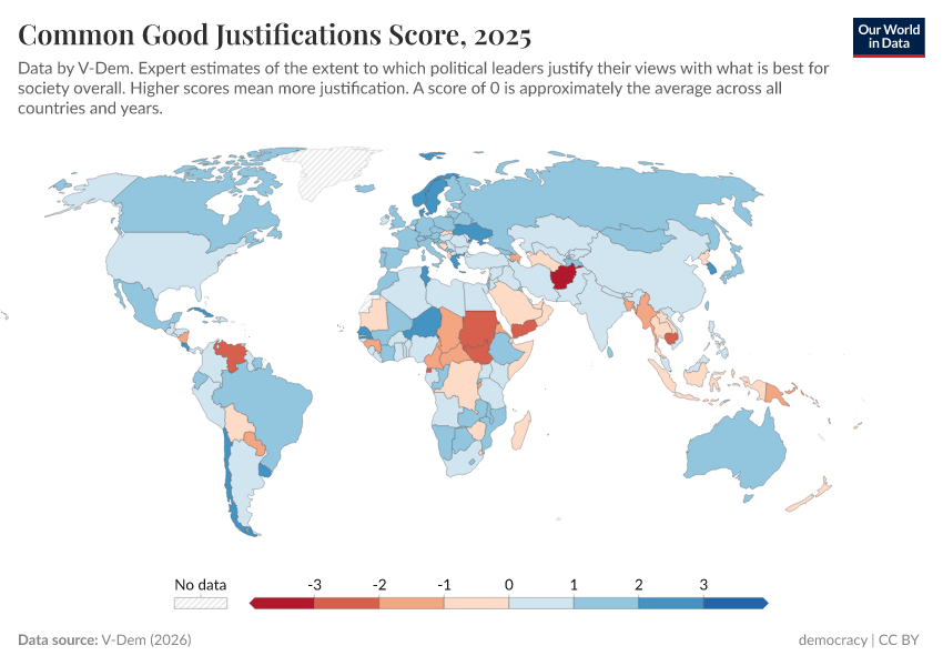 “Data Page: Common good justifications”, part of the following publication: Bastian Herre, Lucas Rodés-Guirao, and Esteban Ortiz-Ospina (2013) - “Democracy”. Data adapted from V-Dem. Retrieved from https://remove-datapage-tags.owid.pages.dev/grapher/common-good-justifications-score [online resource]How to cite this data