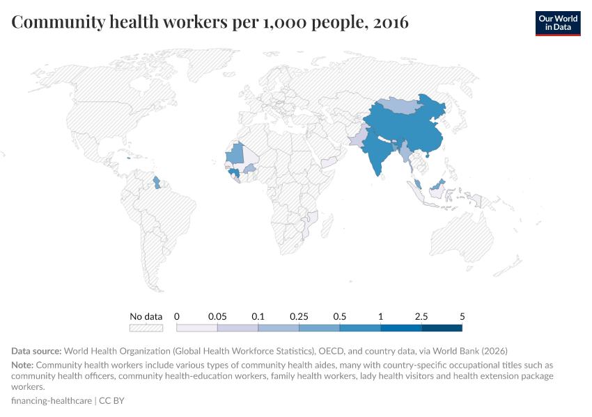 “Data Page: Community health workers per 1,000 people”. Our World in Data (2025). Data adapted from World Health Organization and OECD, via World Bank. Retrieved from https://remove-datapage-tags.owid.pages.dev/grapher/community-health-workers [online resource]How to cite this data