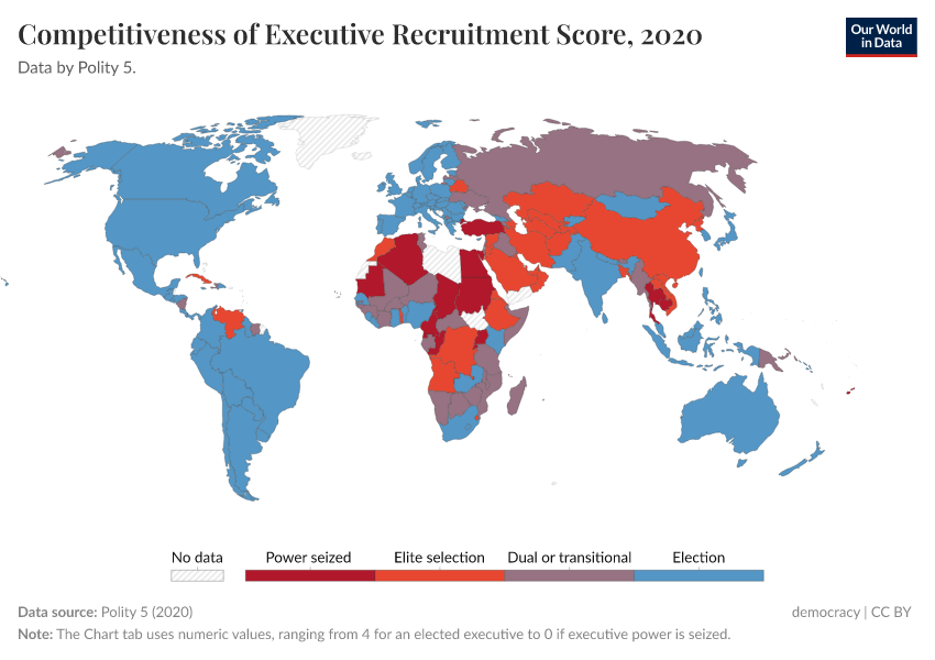 Polity 5 (2020) – processed by Our World in Data. “Competitiveness of executive recruitment score” [dataset]. Polity 5, “Polity5 Project, Political Regime Characteristics and Transitions, 1800-2018 5” [original data]. Retrieved June 26, 2025 from https://remove-datapage-tags.owid.pages.dev/grapher/competitiveness-of-executive-recruitment-score