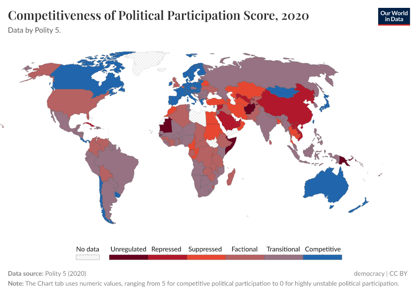 Polity 5 (2020) – processed by Our World in Data. “Competitiveness of political participation score” [dataset]. Polity 5, “Polity5 Project, Political Regime Characteristics and Transitions, 1800-2018 5” [original data]. Retrieved June 26, 2025 from https://remove-datapage-tags.owid.pages.dev/grapher/competitiveness-of-political-participation-score