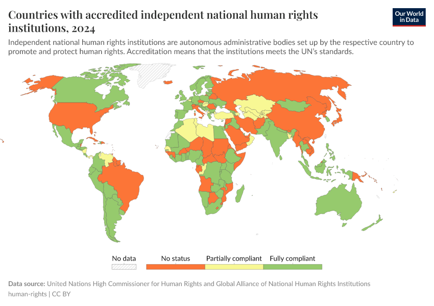 United Nations High Commissioner for Human Rights and Global Alliance of National Human Rights Institutions – processed by Our World in Data. “Countries with accredited independent national human rights institutions” [dataset]. United Nations High Commissioner for Human Rights and Global Alliance of National Human Rights Institutions, “Source: The Office of the United Nations High Commissioner for Human Rights (OHCHR) in collaboration with Global Alliance of National Human Rights Institutions (GANHRI).” [original data]. Retrieved June 26, 2025 from https://remove-datapage-tags.owid.pages.dev/grapher/countries-with-independent-national-human-rights-institution