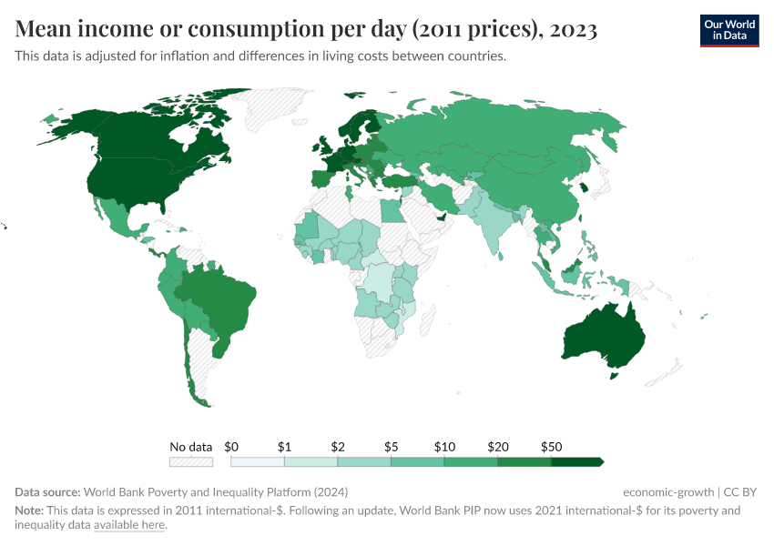 World Bank Poverty and Inequality Platform (2024) – with major processing by Our World in Data. “Mean income or consumption per day – World Bank” [dataset]. World Bank Poverty and Inequality Platform, “World Bank Poverty and Inequality Platform (PIP) 20240627_2017, 20240627_2011” [original data]. Retrieved June 26, 2025 from https://remove-datapage-tags.owid.pages.dev/grapher/daily-mean-income-2011-ppp