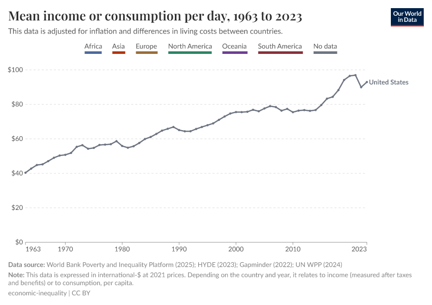 World Bank Poverty and Inequality Platform (2024) – with major processing by Our World in Data. “Mean income or consumption per day – World Bank” [dataset]. World Bank Poverty and Inequality Platform, “World Bank Poverty and Inequality Platform (PIP) 20240627_2017, 20240627_2011” [original data]. Retrieved June 26, 2025 from https://remove-datapage-tags.owid.pages.dev/grapher/daily-mean-income