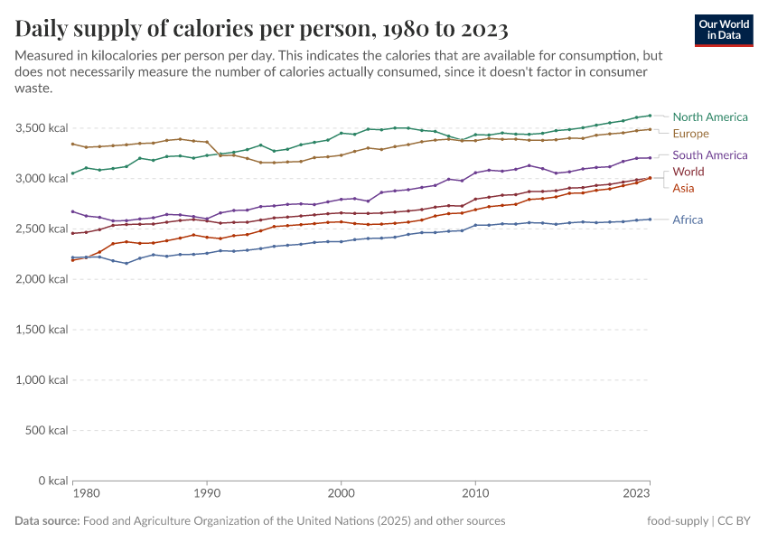 Food and Agriculture Organization of the United Nations (2024); Harris et al. (2015); Floud et al. (2011); Jonsson (1998); Grigg (1995); Fogel (2004); Food and Agriculture Organization of the United Nations (2000); Food and Agriculture Organization of the United Nations (1949); USDA Economic Research Service (ERS) (2015) – with major processing by Our World in Data. “Daily supply of calories per person” [dataset]. Food and Agriculture Organization of the United Nations, “Food Balances: Food Balances (-2013, old methodology and population)”; Food and Agriculture Organization of the United Nations, “Food Balances: Food Balances (2010-)”; Harris et al., “How Many Calories? Food Availability in England and Wales in the Eighteenth and Nineteenth Centuries”; Floud et al., “The Changing Body”; Jonsson, “Changes in food consumption in Iceland, 1770-1940”; Grigg, “The nutritional transition in Western Europe”; Fogel, “The Escape from Hunger and Premature Death”; Food and Agriculture Organization of the United Nations, “The State of Food and Agriculture 2000”; Food and Agriculture Organization of the United Nations, “The State of Food and Agriculture 1949”; USDA Economic Research Service (ERS), “U.S. food supply:  Nutrients and other food components, per capita per day” [original data]. Retrieved June 26, 2025 from https://remove-datapage-tags.owid.pages.dev/grapher/daily-per-capita-caloric-supply