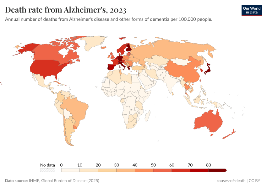 IHME, Global Burden of Disease (2024) – with minor processing by Our World in Data. “Death rate from Alzheimer's” [dataset]. IHME, Global Burden of Disease, “Global Burden of Disease - Deaths and DALYs” [original data]. Retrieved June 26, 2025 from https://remove-datapage-tags.owid.pages.dev/grapher/death-rate-from-alzheimers-other-dementias-gbd
