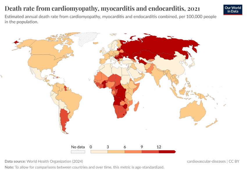 World Health Organization (2024) – with major processing by Our World in Data. “Death rate from cardiomyopathy, myocarditis and endocarditis” [dataset]. World Health Organization, “Global Health Estimates” [original data]. Retrieved June 26, 2025 from https://remove-datapage-tags.owid.pages.dev/grapher/death-rate-from-cardiomyopathy-myocarditis-endocarditis-who-ghe-age-standardized