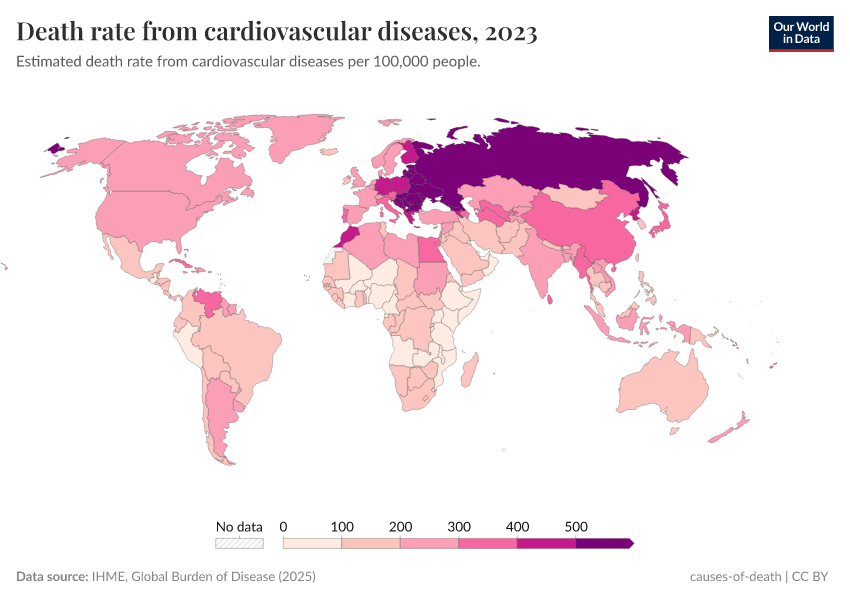 IHME, Global Burden of Disease (2024) – with minor processing by Our World in Data. “Death rate from cardiovascular diseases” [dataset]. IHME, Global Burden of Disease, “Global Burden of Disease - Deaths and DALYs” [original data]. Retrieved June 26, 2025 from https://remove-datapage-tags.owid.pages.dev/grapher/death-rate-from-cardiovascular-diseases