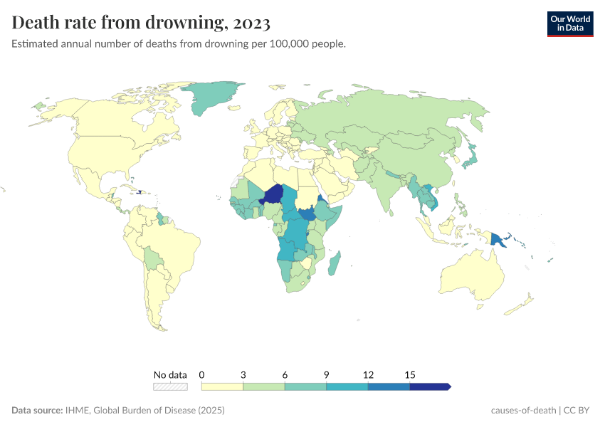 IHME, Global Burden of Disease (2024) – with minor processing by Our World in Data. “Death rate from drowning” [dataset]. IHME, Global Burden of Disease, “Global Burden of Disease - Deaths and DALYs” [original data]. Retrieved June 26, 2025 from https://remove-datapage-tags.owid.pages.dev/grapher/death-rate-from-drowning
