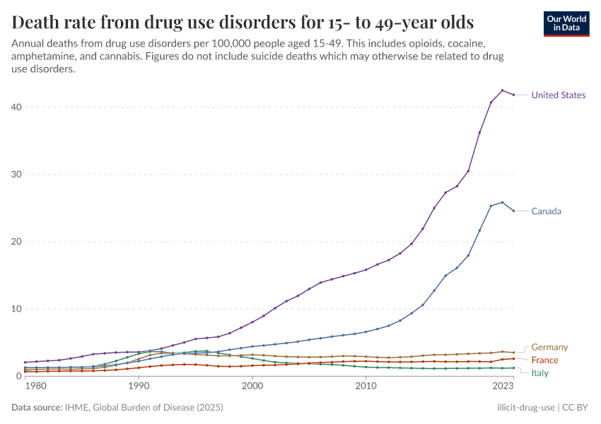 IHME, Global Burden of Disease (2024) – with minor processing by Our World in Data. “Death rate from drug use disorders for 15- to 49-year olds” [dataset]. IHME, Global Burden of Disease, “Global Burden of Disease - Deaths and DALYs” [original data]. Retrieved June 26, 2025 from https://remove-datapage-tags.owid.pages.dev/grapher/death-rate-from-drug-use-disorders-for-15--to-49-year-olds