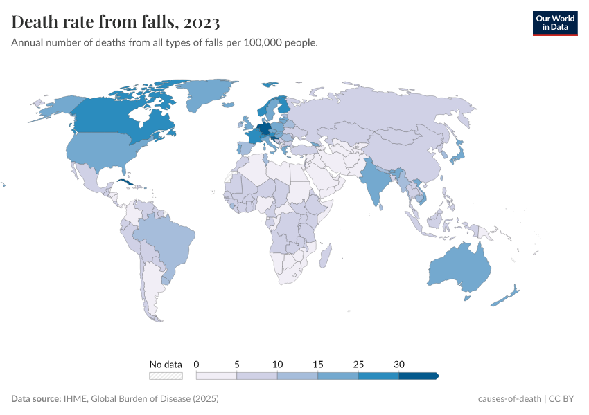 IHME, Global Burden of Disease (2024) – with minor processing by Our World in Data. “Death rate from falls” [dataset]. IHME, Global Burden of Disease, “Global Burden of Disease - Deaths and DALYs” [original data]. Retrieved June 26, 2025 from https://remove-datapage-tags.owid.pages.dev/grapher/death-rate-from-falls-gbd-rate