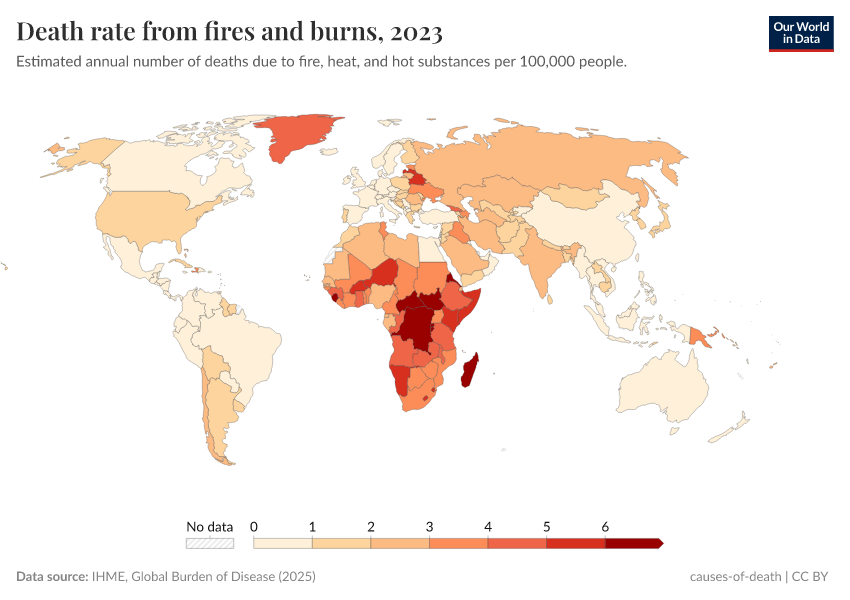 IHME, Global Burden of Disease (2024) – with minor processing by Our World in Data. “Death rate from fires and burns” [dataset]. IHME, Global Burden of Disease, “Global Burden of Disease - Deaths and DALYs” [original data]. Retrieved June 26, 2025 from https://remove-datapage-tags.owid.pages.dev/grapher/death-rate-from-fires-and-burns-ihme
