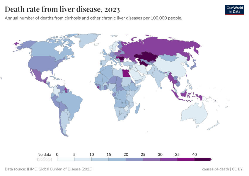 IHME, Global Burden of Disease (2024) – with minor processing by Our World in Data. “Death rate from liver disease” [dataset]. IHME, Global Burden of Disease, “Global Burden of Disease - Deaths and DALYs” [original data]. Retrieved June 26, 2025 from https://remove-datapage-tags.owid.pages.dev/grapher/death-rate-from-liver-disease-gbd