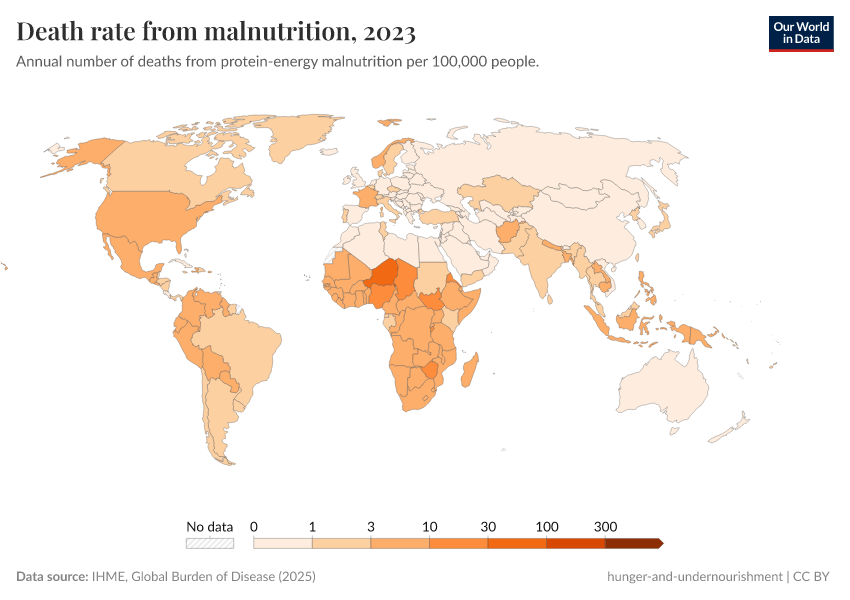 IHME, Global Burden of Disease (2024) – with minor processing by Our World in Data. “Death rate from malnutrition” [dataset]. IHME, Global Burden of Disease, “Global Burden of Disease - Deaths and DALYs” [original data]. Retrieved June 26, 2025 from https://remove-datapage-tags.owid.pages.dev/grapher/death-rate-from-malnutrition