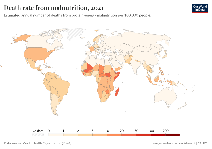 World Health Organization (2024) – with major processing by Our World in Data. “Death rate from malnutrition” [dataset]. World Health Organization, “Global Health Estimates” [original data]. Retrieved June 26, 2025 from https://remove-datapage-tags.owid.pages.dev/grapher/death-rate-from-malnutrition-ghe