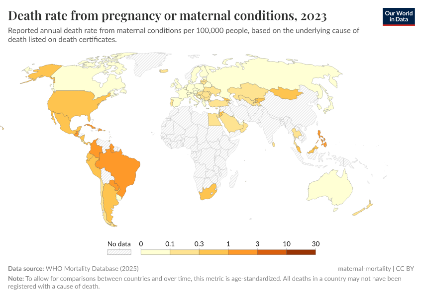 WHO Mortality Database (2024) – with minor processing by Our World in Data. “Death rate from pregnancy or maternal conditions” [dataset]. WHO Mortality Database, “WHO Mortality Database” [original data]. Retrieved June 26, 2025 from https://remove-datapage-tags.owid.pages.dev/grapher/death-rate-from-maternal-disorders