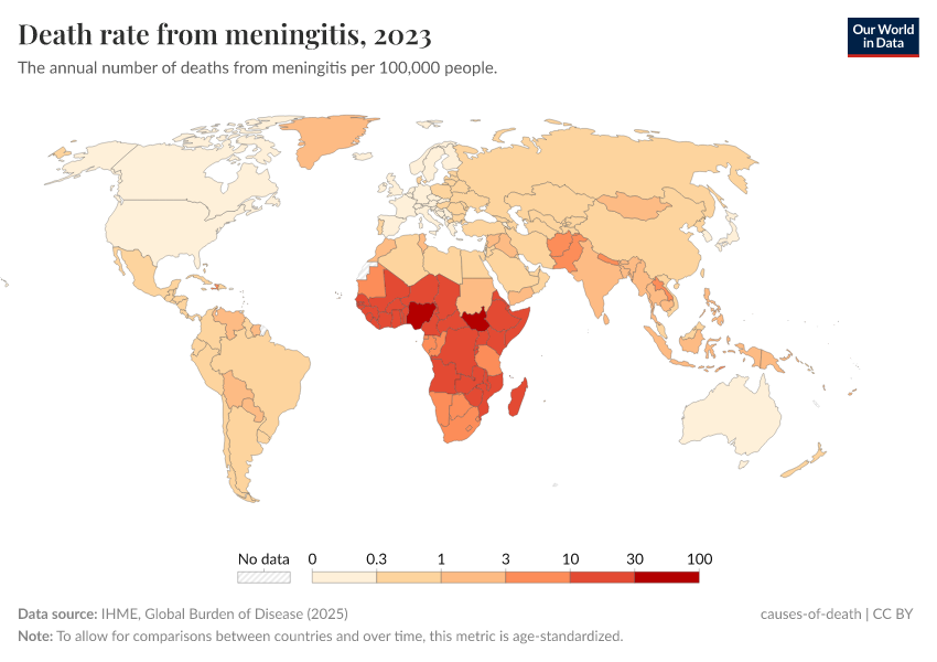 IHME, Global Burden of Disease (2024) – with minor processing by Our World in Data. “Death rate from meningitis” [dataset]. IHME, Global Burden of Disease, “Global Burden of Disease - Deaths and DALYs” [original data]. Retrieved June 26, 2025 from https://remove-datapage-tags.owid.pages.dev/grapher/death-rate-from-meningitis