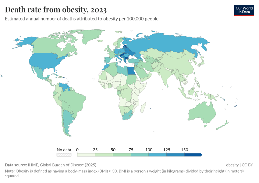 IHME, Global Burden of Disease (2024) – with minor processing by Our World in Data. “Death rate from obesity” [dataset]. IHME, Global Burden of Disease, “Global Burden of Disease - Risk Factors” [original data]. Retrieved June 26, 2025 from https://remove-datapage-tags.owid.pages.dev/grapher/death-rate-from-obesity-gbd