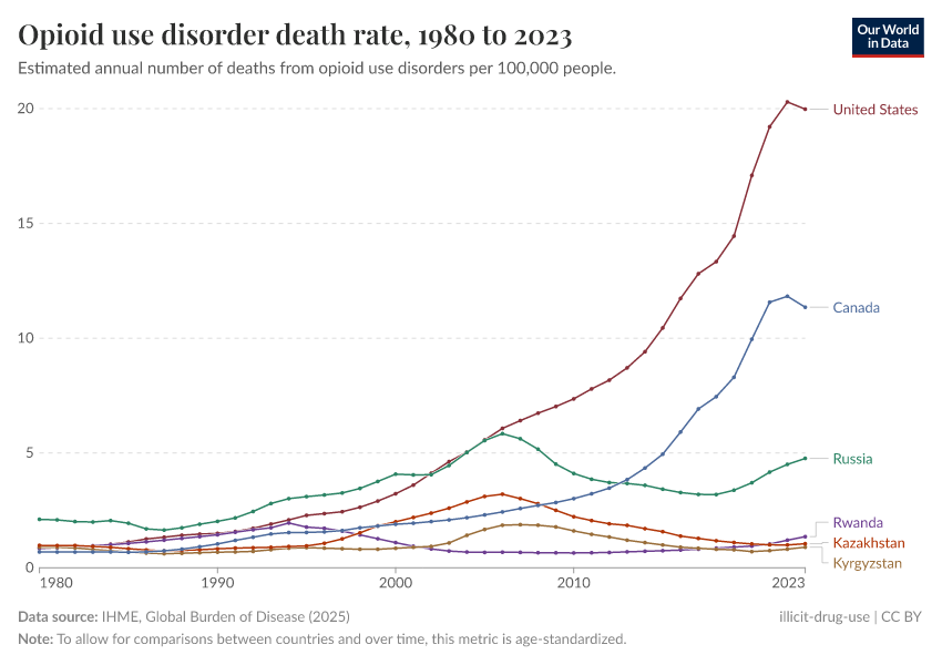IHME, Global Burden of Disease (2024) – with minor processing by Our World in Data. “Opioid use disorder death rate” [dataset]. IHME, Global Burden of Disease, “Global Burden of Disease - Deaths and DALYs” [original data]. Retrieved June 26, 2025 from https://remove-datapage-tags.owid.pages.dev/grapher/death-rate-from-opioid-use