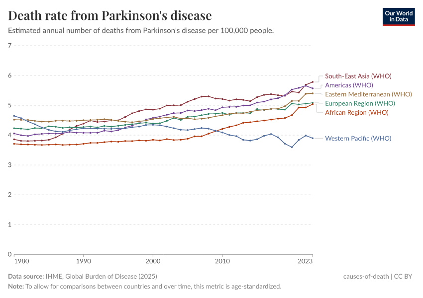 IHME, Global Burden of Disease (2024) – with minor processing by Our World in Data. “Death rate from Parkinson's disease” [dataset]. IHME, Global Burden of Disease, “Global Burden of Disease - Deaths and DALYs” [original data]. Retrieved June 26, 2025 from https://remove-datapage-tags.owid.pages.dev/grapher/death-rate-from-parkinsons-disease
