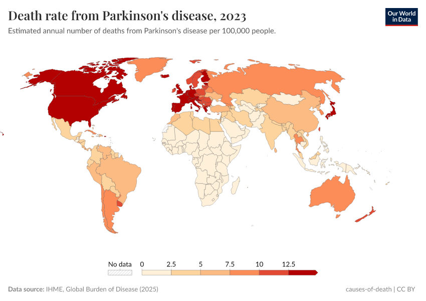IHME, Global Burden of Disease (2024) – with minor processing by Our World in Data. “Death rate from Parkinson's disease” [dataset]. IHME, Global Burden of Disease, “Global Burden of Disease - Deaths and DALYs” [original data]. Retrieved June 26, 2025 from https://remove-datapage-tags.owid.pages.dev/grapher/death-rate-from-parkinsons-disease-gbd