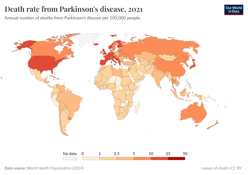 World Health Organization (2024) – with major processing by Our World in Data. “Death rate from Parkinson's disease” [dataset]. World Health Organization, “Global Health Estimates” [original data]. Retrieved June 26, 2025 from https://remove-datapage-tags.owid.pages.dev/grapher/death-rate-from-parkinsons-disease-ghe