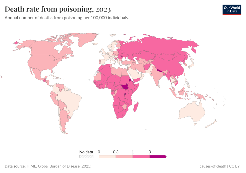 IHME, Global Burden of Disease (2024) – with minor processing by Our World in Data. “Death rate from poisoning” [dataset]. IHME, Global Burden of Disease, “Global Burden of Disease - Deaths and DALYs” [original data]. Retrieved June 26, 2025 from https://remove-datapage-tags.owid.pages.dev/grapher/death-rate-from-poisoning-gbd