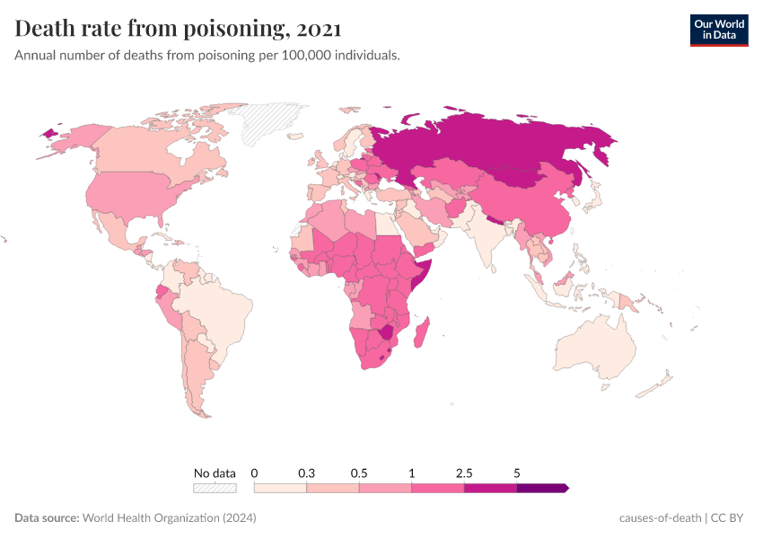 World Health Organization (2024) – with major processing by Our World in Data. “Death rate from poisoning” [dataset]. World Health Organization, “Global Health Estimates” [original data]. Retrieved June 26, 2025 from https://remove-datapage-tags.owid.pages.dev/grapher/death-rate-from-poisoning-ghe