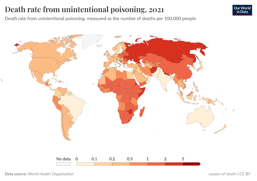 “Data Page: Death rate from unintentional poisoning”. Our World in Data (2025). Data adapted from World Health Organization. Retrieved from https://remove-datapage-tags.owid.pages.dev/grapher/death-rate-from-poisonings [online resource]How to cite this data
