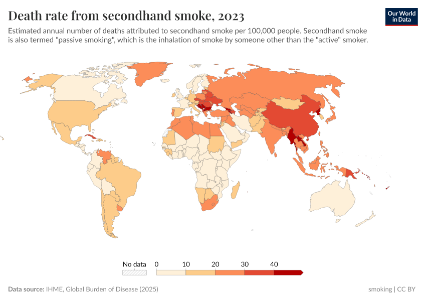 IHME, Global Burden of Disease (2024) – with minor processing by Our World in Data. “Death rate from secondhand smoke” [dataset]. IHME, Global Burden of Disease, “Global Burden of Disease - Risk Factors” [original data]. Retrieved June 26, 2025 from https://remove-datapage-tags.owid.pages.dev/grapher/death-rate-from-secondhand-smoke-gbd