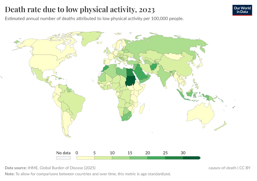 IHME, Global Burden of Disease (2024) – with minor processing by Our World in Data. “Death rate due to low physical activity” [dataset]. IHME, Global Burden of Disease, “Global Burden of Disease - Risk Factors” [original data]. Retrieved June 26, 2025 from https://remove-datapage-tags.owid.pages.dev/grapher/death-rates-due-to-low-physical-activity