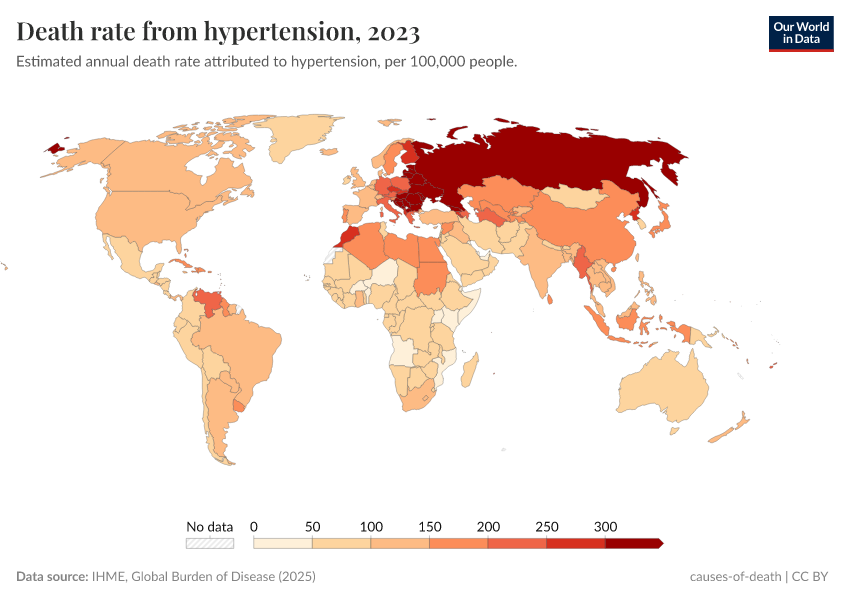 IHME, Global Burden of Disease (2024) – with minor processing by Our World in Data. “Death rate from hypertension” [dataset]. IHME, Global Burden of Disease, “Global Burden of Disease - Risk Factors” [original data]. Retrieved June 26, 2025 from https://remove-datapage-tags.owid.pages.dev/grapher/death-rates-from-high-blood-pressure-gbd