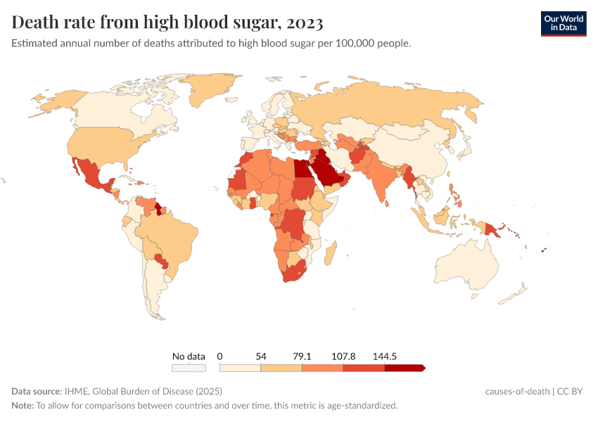 IHME, Global Burden of Disease (2024) – with minor processing by Our World in Data. “Death rate from high blood sugar” [dataset]. IHME, Global Burden of Disease, “Global Burden of Disease - Risk Factors” [original data]. Retrieved June 26, 2025 from https://remove-datapage-tags.owid.pages.dev/grapher/death-rates-from-high-blood-sugar