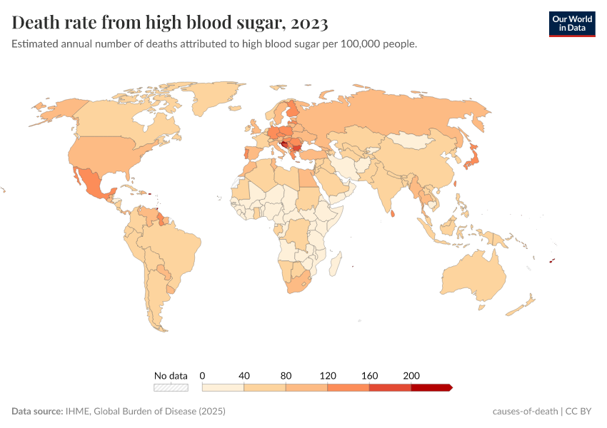 IHME, Global Burden of Disease (2024) – with minor processing by Our World in Data. “Death rate from high blood sugar” [dataset]. IHME, Global Burden of Disease, “Global Burden of Disease - Risk Factors” [original data]. Retrieved June 26, 2025 from https://remove-datapage-tags.owid.pages.dev/grapher/death-rates-from-high-blood-sugar-gbd