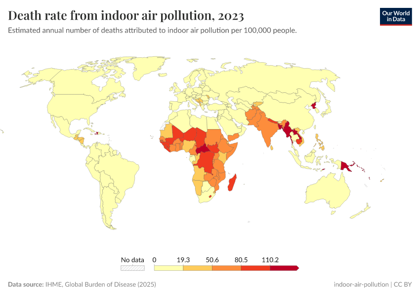 IHME, Global Burden of Disease (2024) – with minor processing by Our World in Data. “Death rate from indoor air pollution” [dataset]. IHME, Global Burden of Disease, “Global Burden of Disease - Risk Factors” [original data]. Retrieved June 26, 2025 from https://remove-datapage-tags.owid.pages.dev/grapher/death-rates-from-indoor-air-pollution-gbd