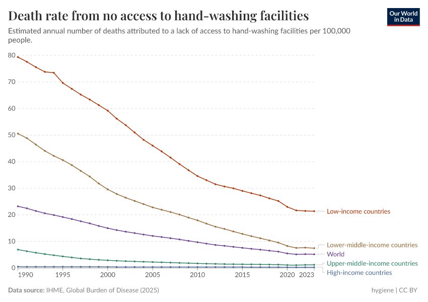 IHME, Global Burden of Disease (2024) – with minor processing by Our World in Data. “Death rate from no access to hand-washing facilities” [dataset]. IHME, Global Burden of Disease, “Global Burden of Disease - Risk Factors” [original data]. Retrieved June 26, 2025 from https://remove-datapage-tags.owid.pages.dev/grapher/death-rates-no-handwashing