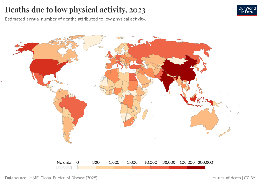 IHME, Global Burden of Disease (2024) – with minor processing by Our World in Data. “Deaths due to low physical activity” [dataset]. IHME, Global Burden of Disease, “Global Burden of Disease - Risk Factors” [original data]. Retrieved June 26, 2025 from https://remove-datapage-tags.owid.pages.dev/grapher/deaths-due-to-low-physical-activity