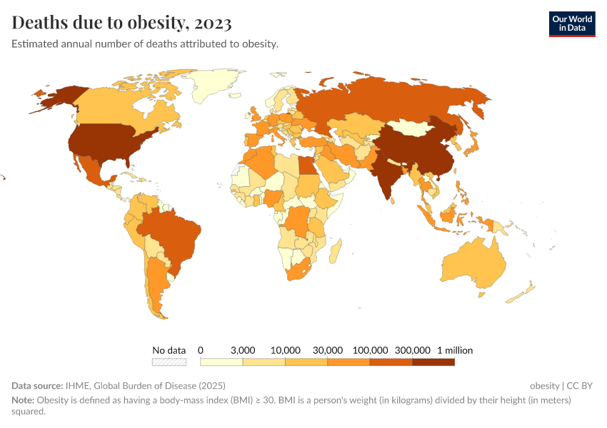 IHME, Global Burden of Disease (2024) – with minor processing by Our World in Data. “Deaths due to obesity” [dataset]. IHME, Global Burden of Disease, “Global Burden of Disease - Risk Factors” [original data]. Retrieved June 26, 2025 from https://remove-datapage-tags.owid.pages.dev/grapher/deaths-due-to-obesity
