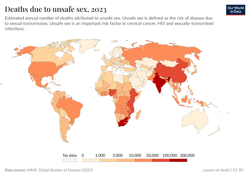 IHME, Global Burden of Disease (2024) – with minor processing by Our World in Data. “Deaths due to unsafe sex” [dataset]. IHME, Global Burden of Disease, “Global Burden of Disease - Risk Factors” [original data]. Retrieved June 26, 2025 from https://remove-datapage-tags.owid.pages.dev/grapher/deaths-due-to-unsafe-sex