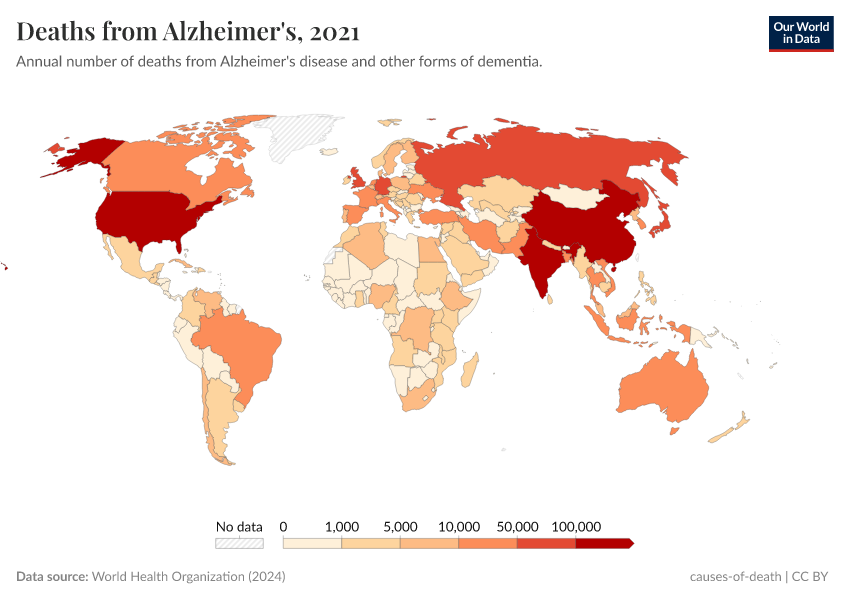 World Health Organization (2024) – with major processing by Our World in Data. “Deaths from Alzheimer's” [dataset]. World Health Organization, “Global Health Estimates” [original data]. Retrieved June 26, 2025 from https://remove-datapage-tags.owid.pages.dev/grapher/deaths-from-alzheimers-other-dementias