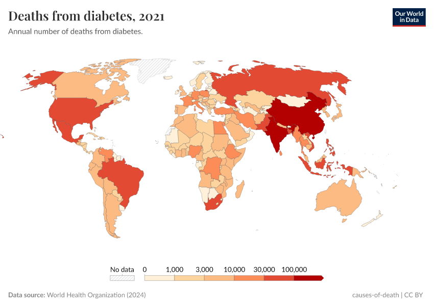 World Health Organization (2024) – with major processing by Our World in Data. “Deaths from diabetes” [dataset]. World Health Organization, “Global Health Estimates” [original data]. Retrieved June 26, 2025 from https://remove-datapage-tags.owid.pages.dev/grapher/deaths-from-diabetes-ghe