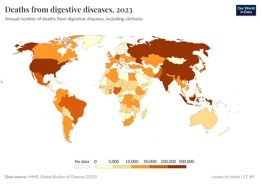 IHME, Global Burden of Disease (2024) – with minor processing by Our World in Data. “Deaths from digestive diseases” [dataset]. IHME, Global Burden of Disease, “Global Burden of Disease - Deaths and DALYs” [original data]. Retrieved June 26, 2025 from https://remove-datapage-tags.owid.pages.dev/grapher/deaths-from-digestive-diseases