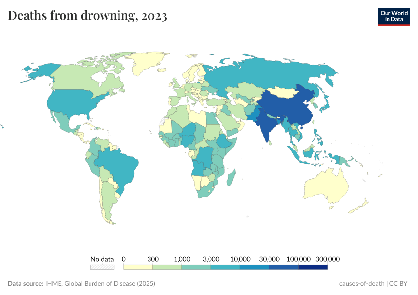 IHME, Global Burden of Disease (2024) – with minor processing by Our World in Data. “Deaths from drowning” [dataset]. IHME, Global Burden of Disease, “Global Burden of Disease - Deaths and DALYs” [original data]. Retrieved June 26, 2025 from https://remove-datapage-tags.owid.pages.dev/grapher/deaths-from-drowning