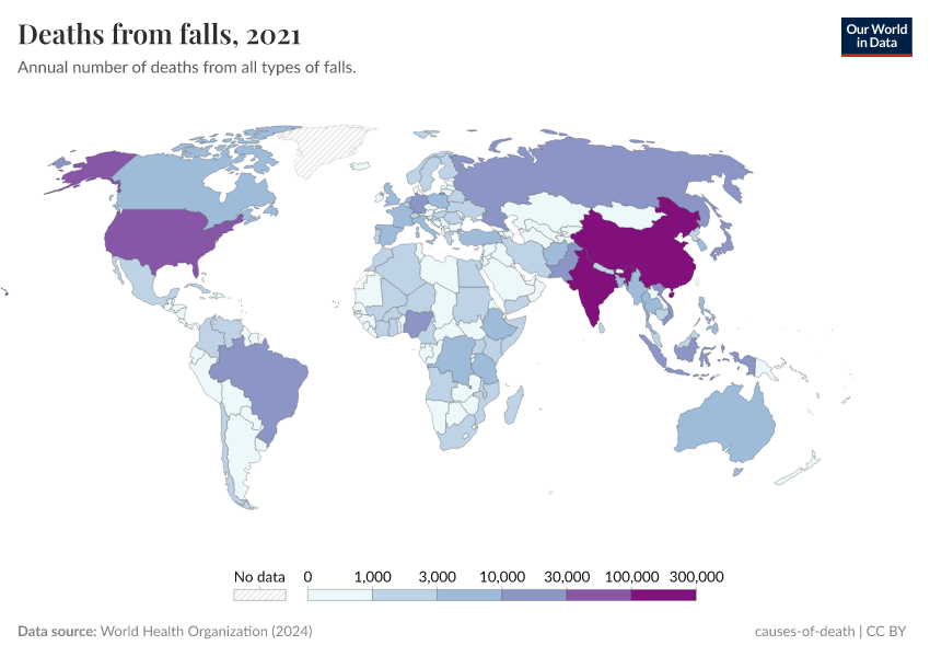 World Health Organization (2024) – with major processing by Our World in Data. “Deaths from falls” [dataset]. World Health Organization, “Global Health Estimates” [original data]. Retrieved June 26, 2025 from https://remove-datapage-tags.owid.pages.dev/grapher/deaths-from-falls