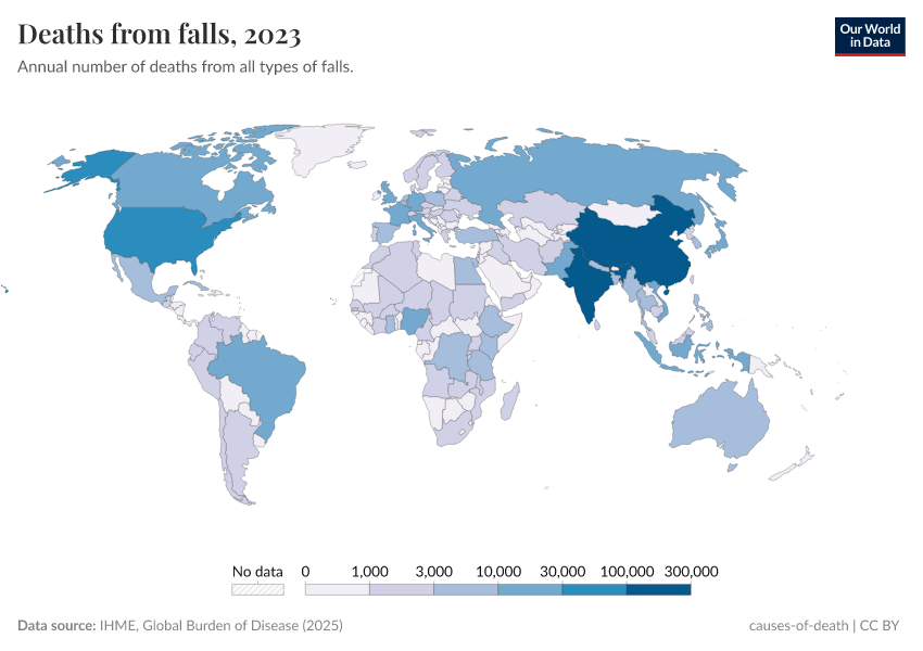 IHME, Global Burden of Disease (2024) – with minor processing by Our World in Data. “Deaths from falls” [dataset]. IHME, Global Burden of Disease, “Global Burden of Disease - Deaths and DALYs” [original data]. Retrieved June 26, 2025 from https://remove-datapage-tags.owid.pages.dev/grapher/deaths-from-falls-gbd